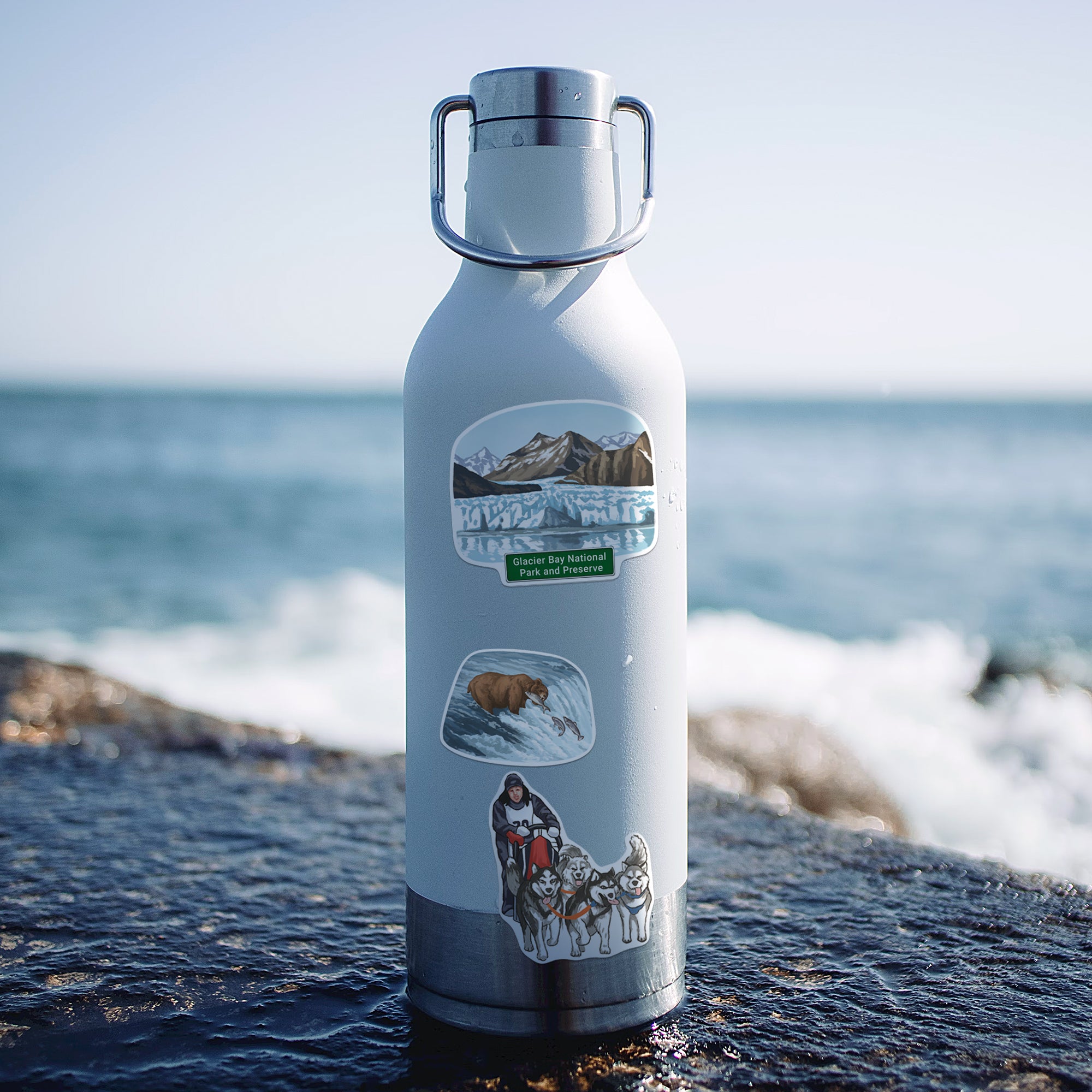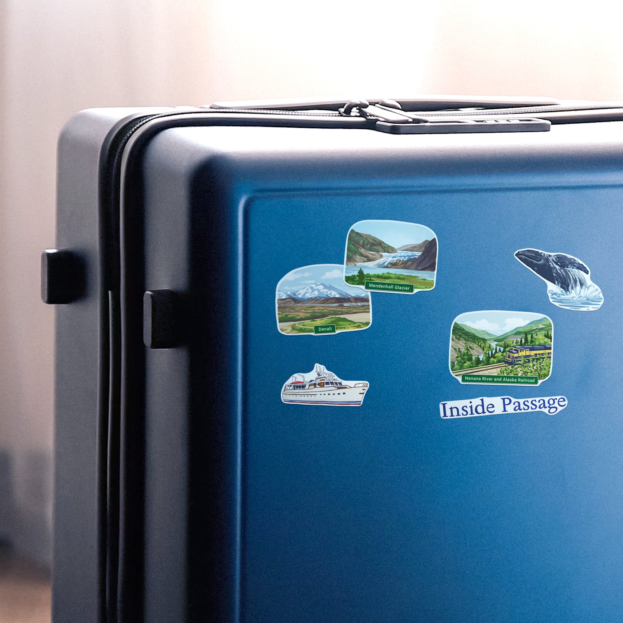 EXPLORE ALASKA’S LANDMARKS. Experience the majesty of Alaska's wilderness with stickers featuring Glacier Bay, Mendenhall Glacier, and the Northern Lights. Relive thrilling adventures with depictions of Denali, Brooks Falls, and the whale bone arch of Utqiagvik, adding vibrancy to your travel tales.