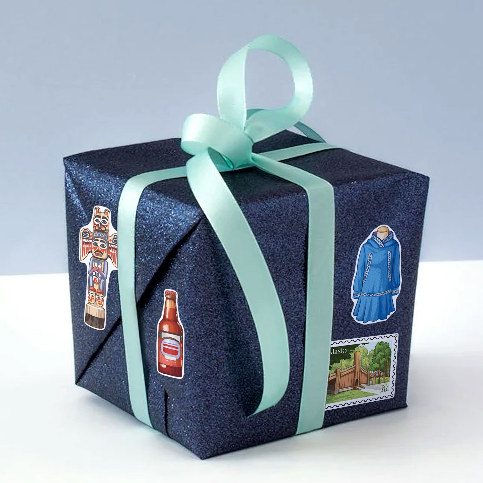 TASTE OF ALASKA'S DELIGHTS. Savor Alaskan cuisine with stickers highlighting Indian Candy, Reindeer Sausage, and Alaskan Amber Ale. Immerse in the state’s cultural heritage with symbols like the traditional Kuspuk and a stamp of the Alaska Native Heritage Center, all woven into this adventurous collection.
