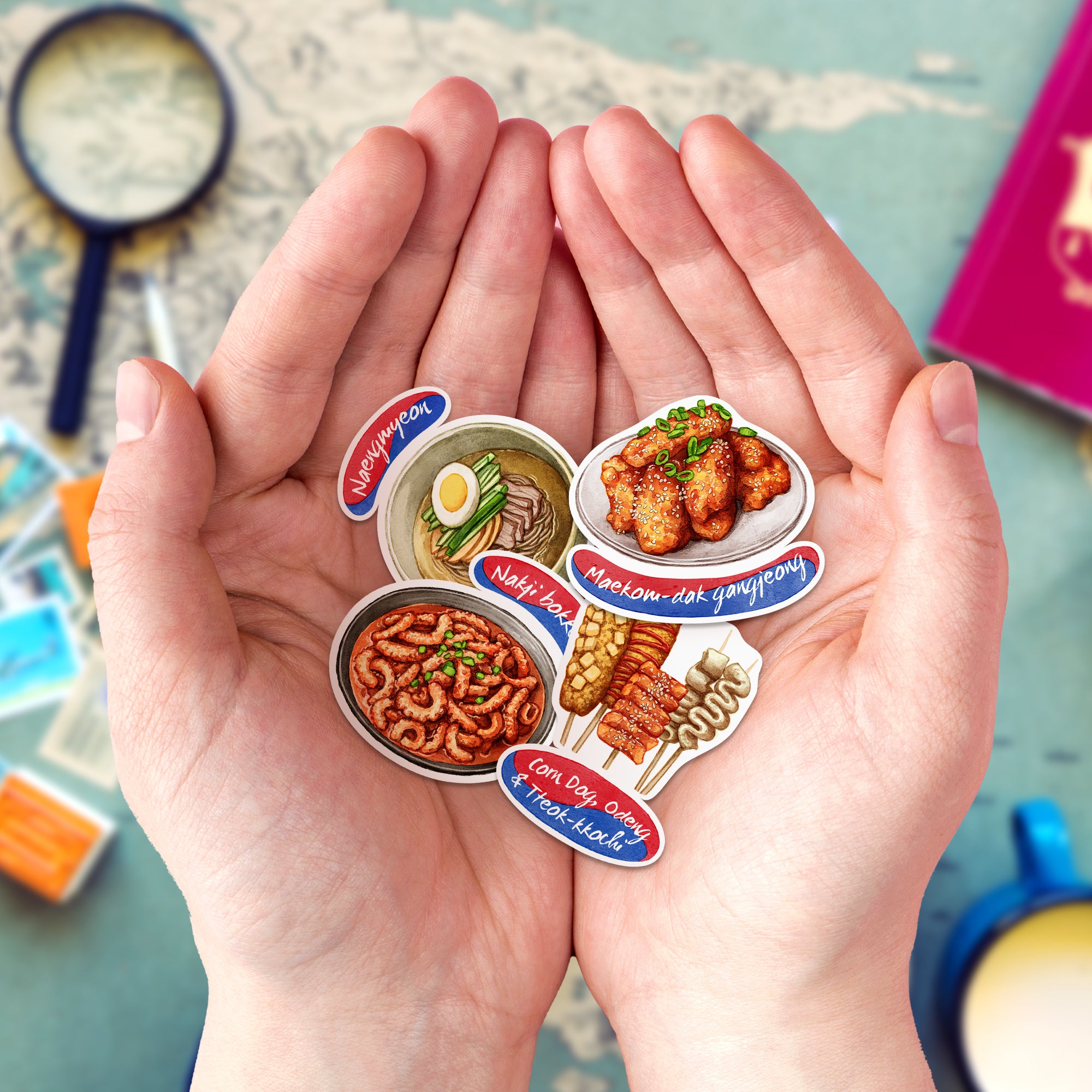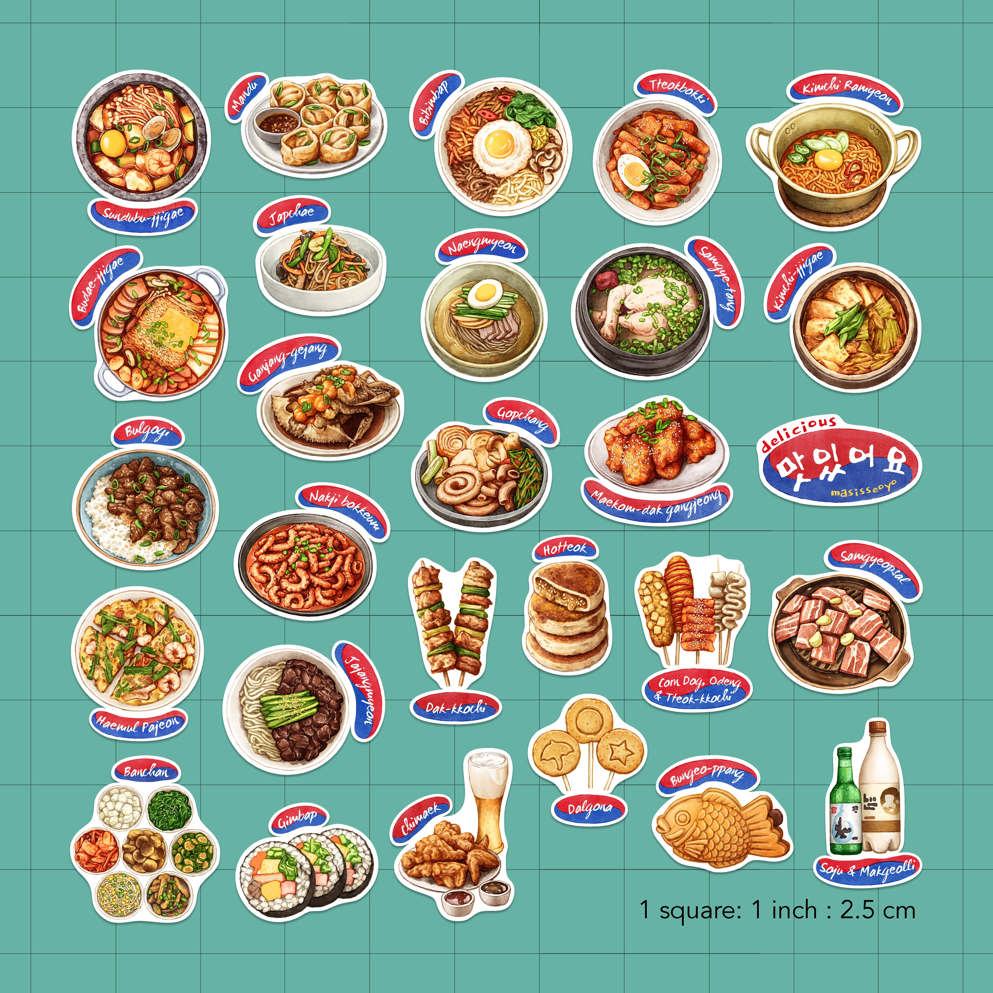 - 28 PIECES OF DIE-CUT KOREAN CUISINE STICKERS. Sized from 1 to 2.5 inches, each sticker features carefully illustrated designs that capture the essence of Korea’s culinary icons. From sizzling street food to comforting stews and beloved traditional dishes, these stickers bring the vibrant taste of Korea straight to your journals, postcards, laptops, phone cases and water bottles.