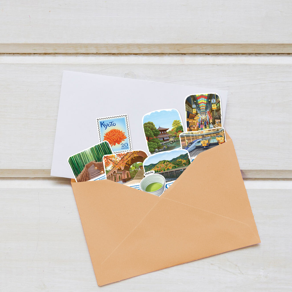 - 28 HAND-PAINTED KYOTO STICKERS. Explore Japan’s cultural capital with 28 gouache-style designs sized 1 to 2.5 inches, featuring temples, gardens, cuisine, and traditions. Perfect for scrapbooks, journals, and travel keepsakes.
