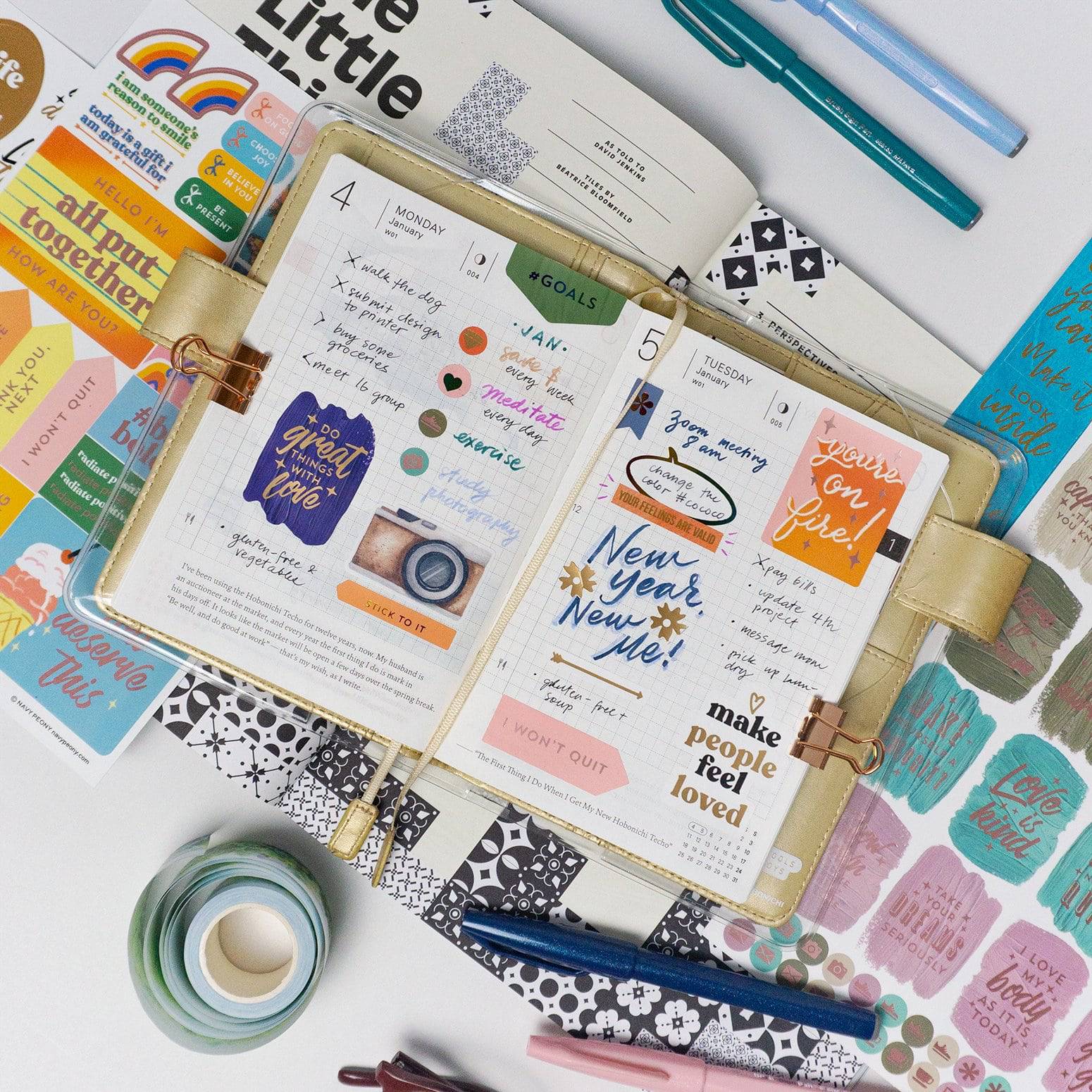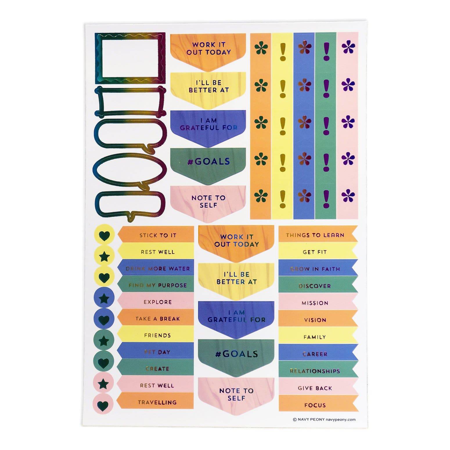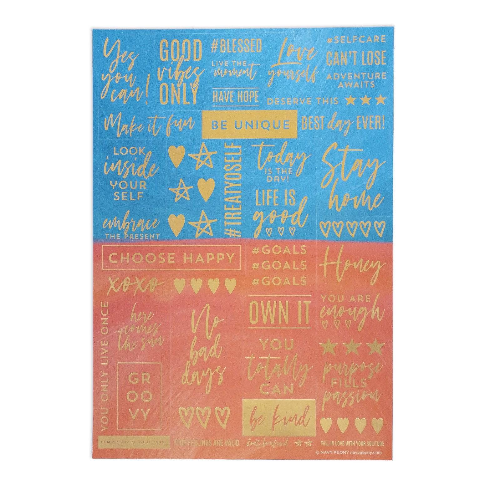 Navy Peony's Motivational Quote Sticker Set (6 Sheets) is full of little messages to brighten up the day. The set is composed of 6 gold foil-illuminated sheets, about 270 stickers for journalling, scrapbooking, or any use.