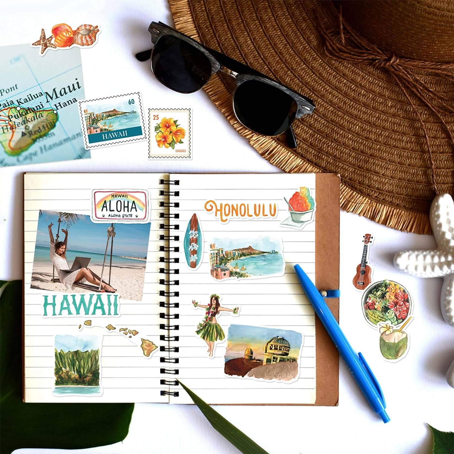 - VIBRANT CULTURE & GASTRONOMY. Add depth to your journal by incorporating Hawaii's culture through stickers featuring Hula, Lei, Tiki Statues, the melodious Ukulele, Surfboard, the Green Sea Turtle, vibrant flowers, and delicate shells. Enjoy this cultural voyage while savoring iconic Hawaiian delights like Poke, Spam Musubi, Shaved Ice, and refreshing Coconut Juice.