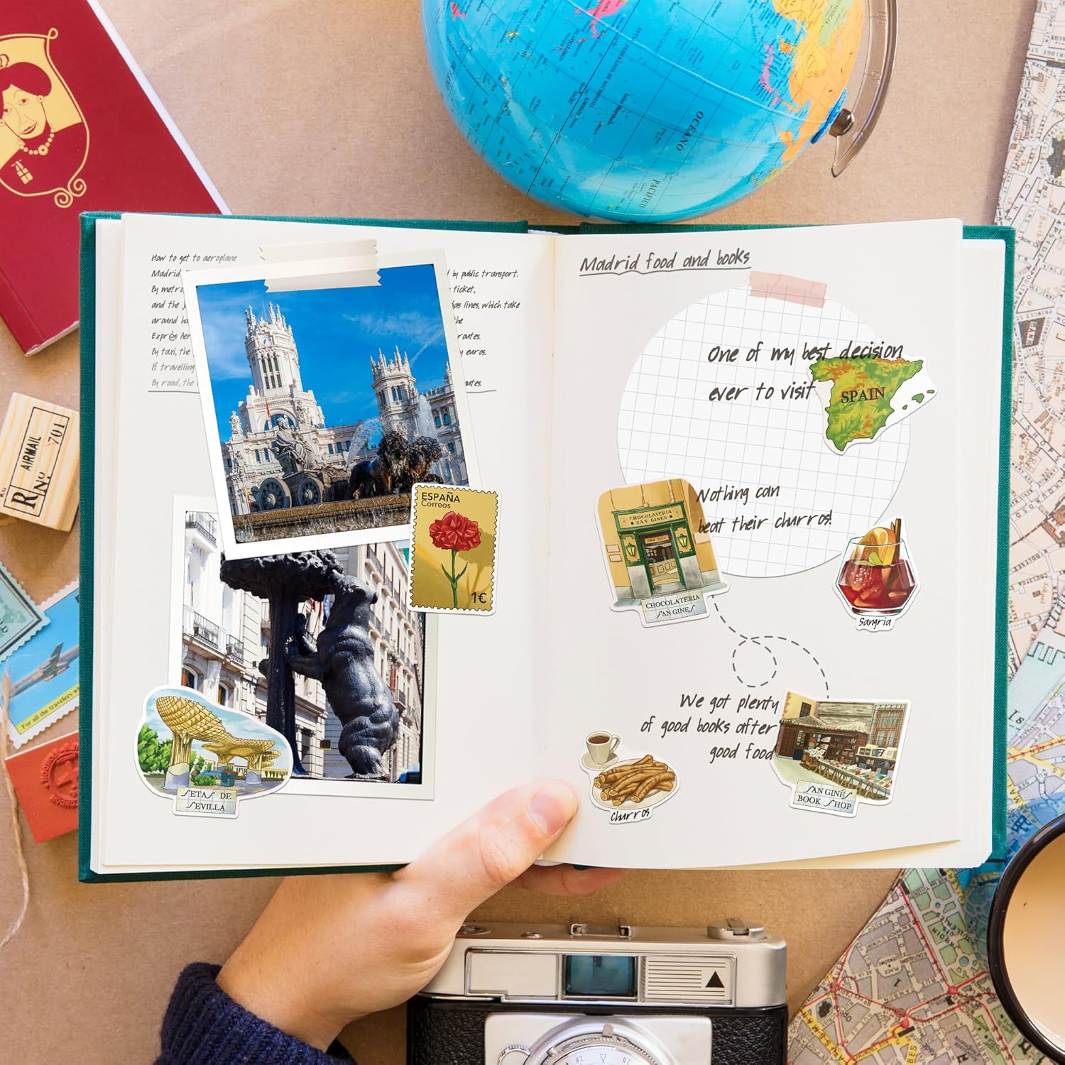 POSTAGE STAMPS & LOCATION NAMES. Enhance your travel keepsakes with postage stamp stickers featuring Spain's national flower, the Red Carnation, and iconic landmarks like Museo Nacional del Prado. Location names like Madrid, Granada, Seville, and Cordoba serve as delightful reminders of your Spanish journey, ensuring your memories of this picturesque country endure.
