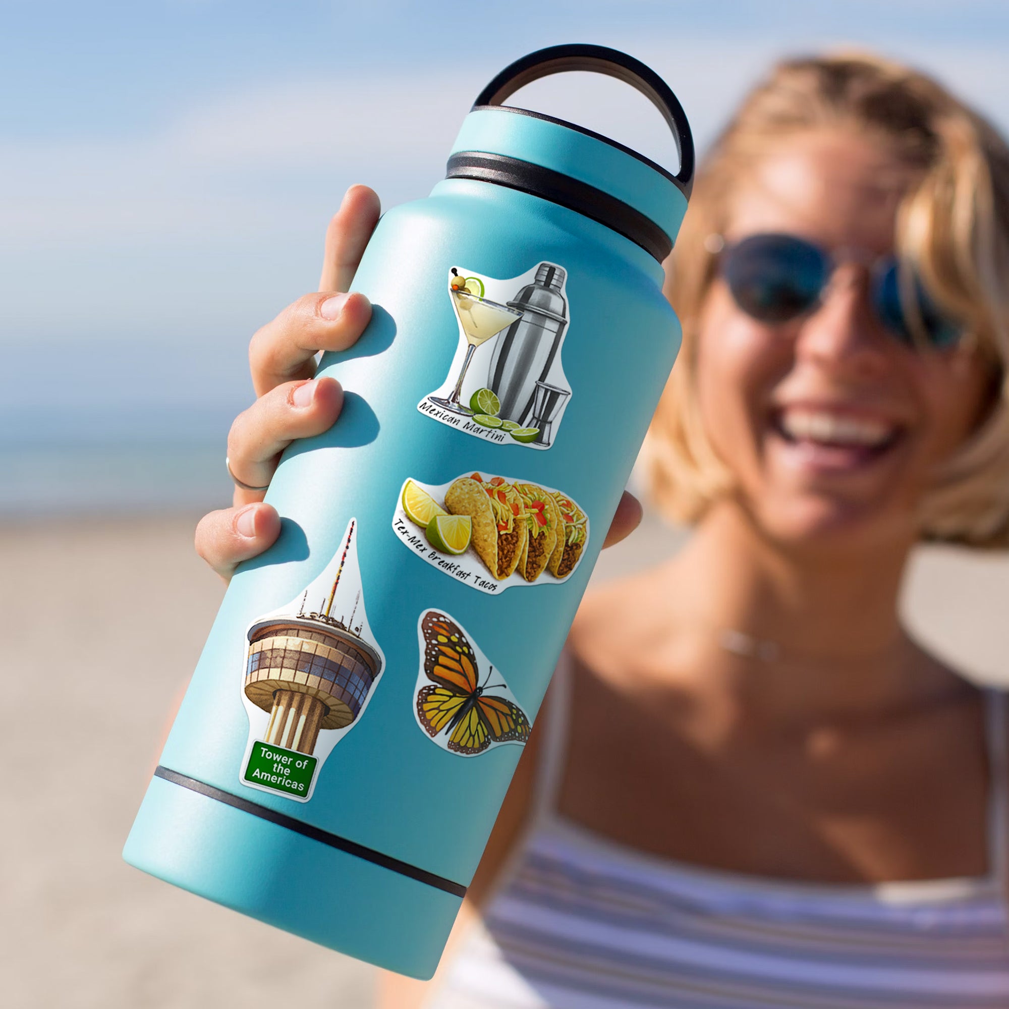 TASTE OF TEXAS HERITAGE. Embrace the spirit of Texas with symbols like the legendary Longhorn cattle, the iconic cowboy hat, and the oil drill representing the state's rich history. Savor the state's culinary delights with stickers featuring Tex-Mex breakfast tacos, mouthwatering Texas BBQ, and the refreshing Mexican Martini.