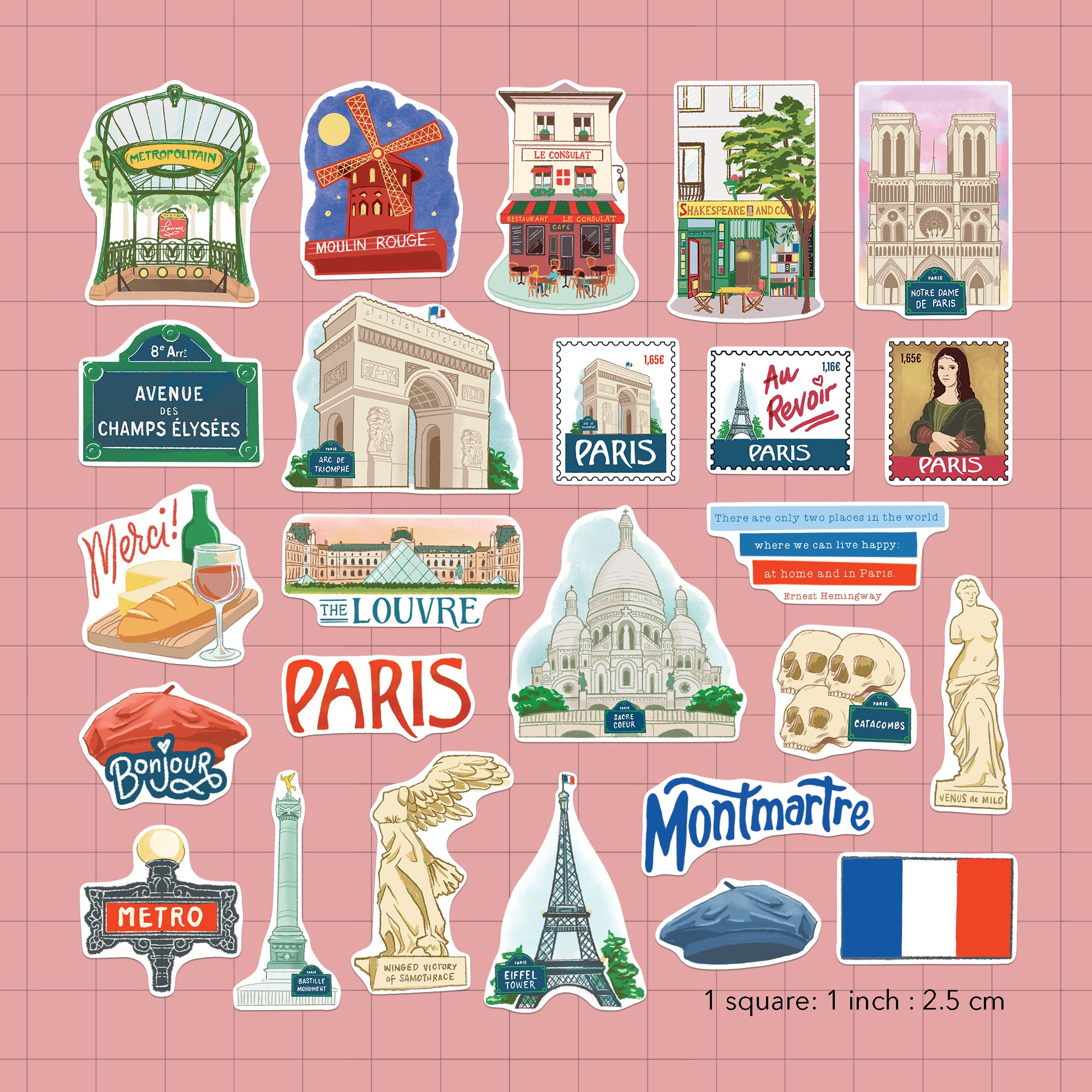- PARIS, THE CITY OF LIGHTS - Add some Parisian charm to your travel journalling and scrapbooking with our Paris travel stickers featuring iconic landmarks, arts and culture, and architecture such as the Eiffel Tower, Notre-Dame, Arc de Triomphe, and the Louvre Museum, as well as artistic and cultural references such the Paris Métro, beret, cafés, and the most famous street Champs Élysées.