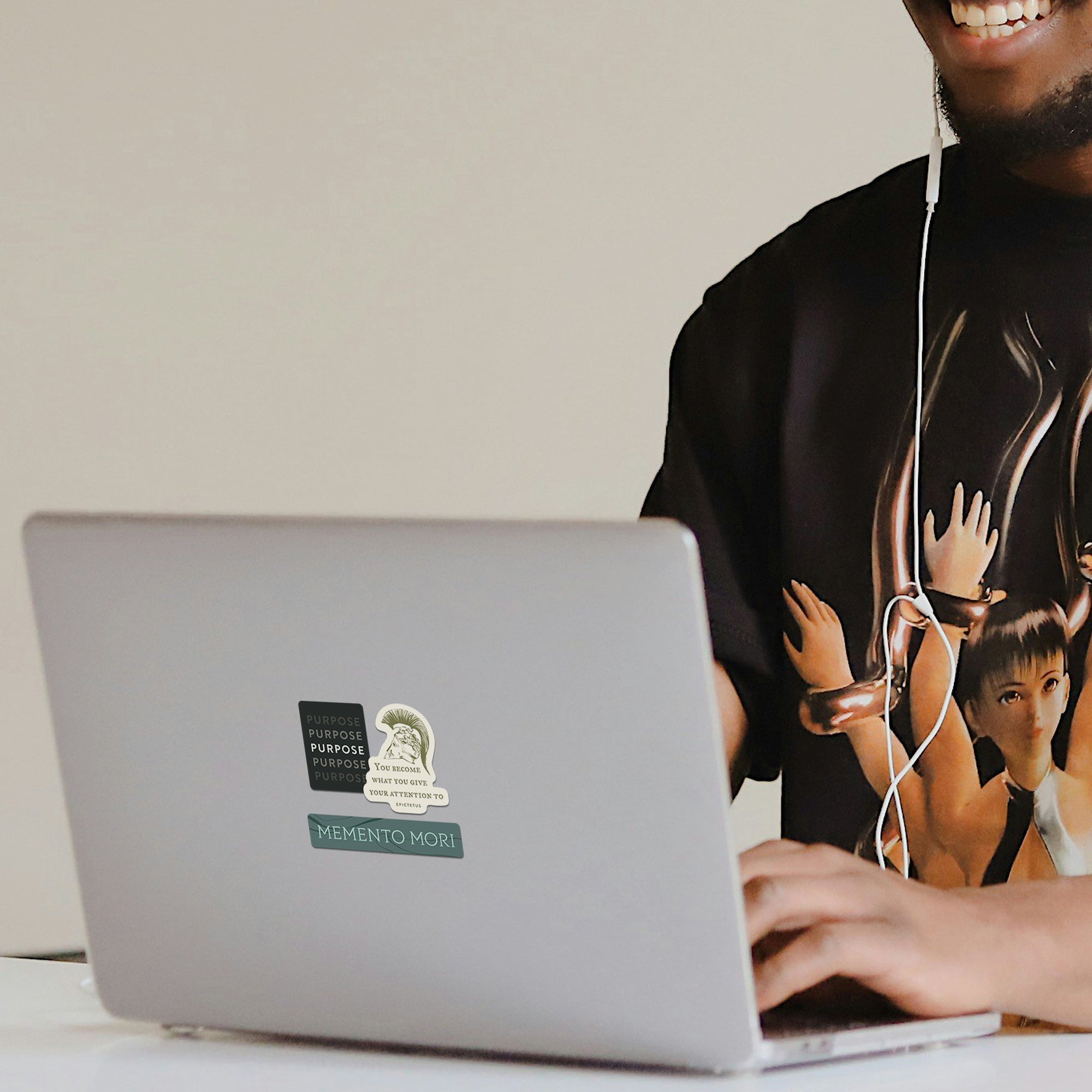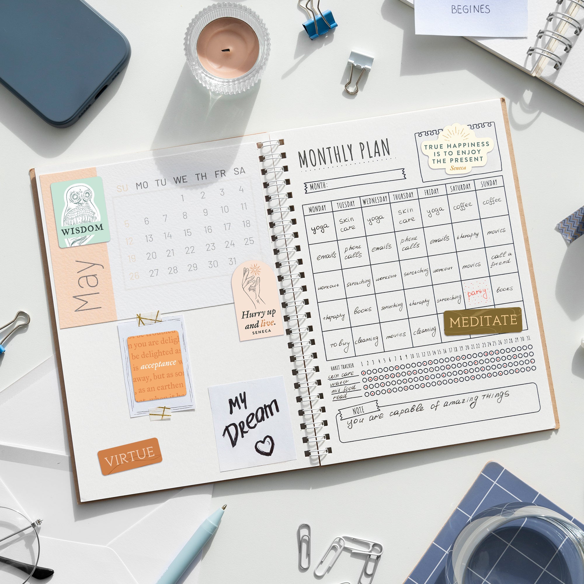 30 INSPIRING STICKERS. Elevate your journal, planner, or vision board with words like "Amor Fati," "Memento Mori," "Inner Peace," and "Clarity," thoughtfully crafted to serve as daily anchors of calm and reflection. Ideal for centering your thoughts, each sticker encapsulates essential Stoic practices and principles.