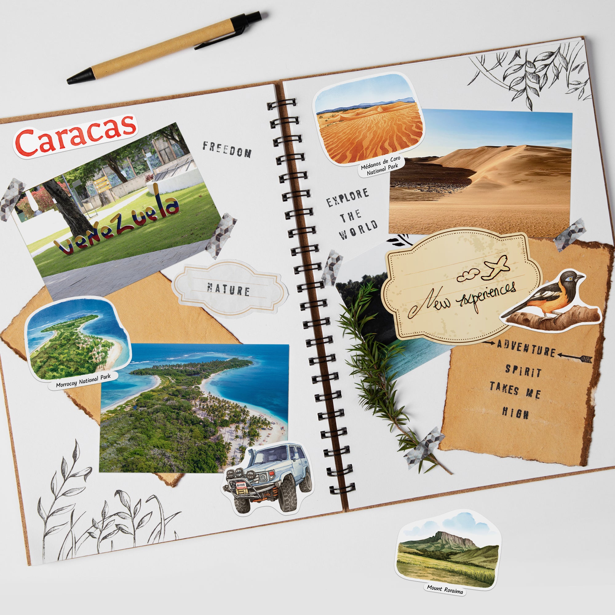 - 28 STUNNING DIE-CUT PIECES. Decorate with detailed stickers of Venezuela’s treasures—Angel Falls' thunderous descent, the mysterious Mount Roraima, or the windswept dunes of Médanos de Coro. Celebrate the charm of Isla Margarita, the elegance of Plaza Francia, and the history of Simón Bolívar with thoughtful illustrations.