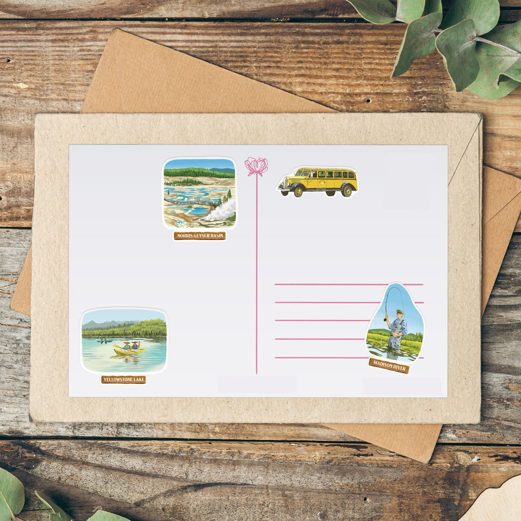 - A STICKER SAFARI THROUGH YELLOWSTONE. Journey through America’s first national park with 28 hand-illustrated designs capturing its legendary geysers, valleys, and wildlife. Perfect for scrapbooks, journals, postcards, and outdoor memories.
